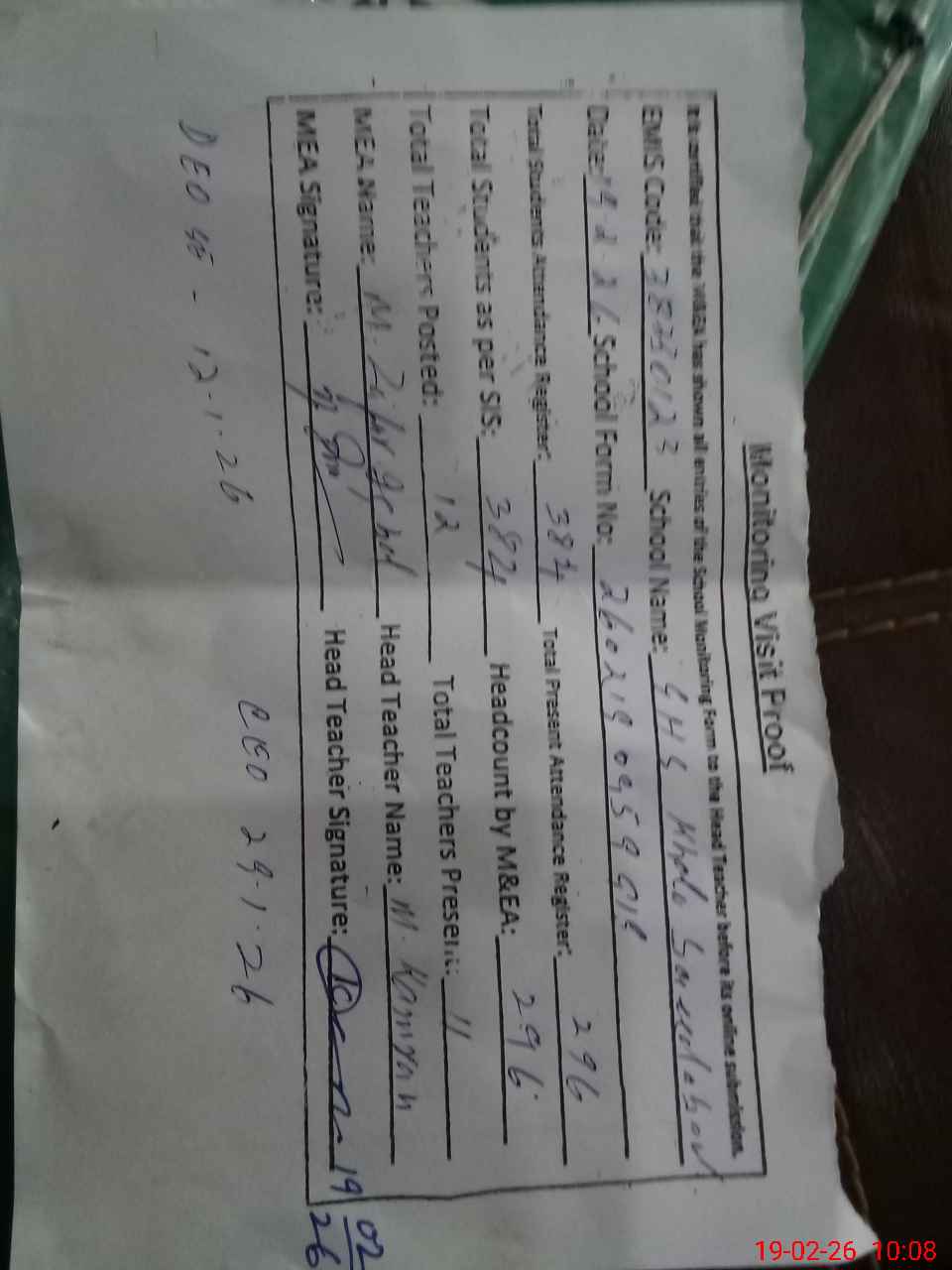 | Attendance Register | Head Teacher | MEA with School | Visit Proof |