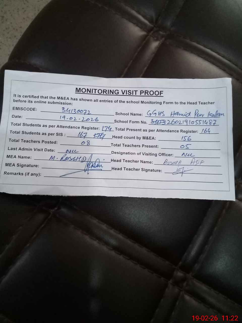 | Certified that this School was Inspected by the Undersigned MEA/DMO Today and the Information Stated Above is as Per Record. | |||||