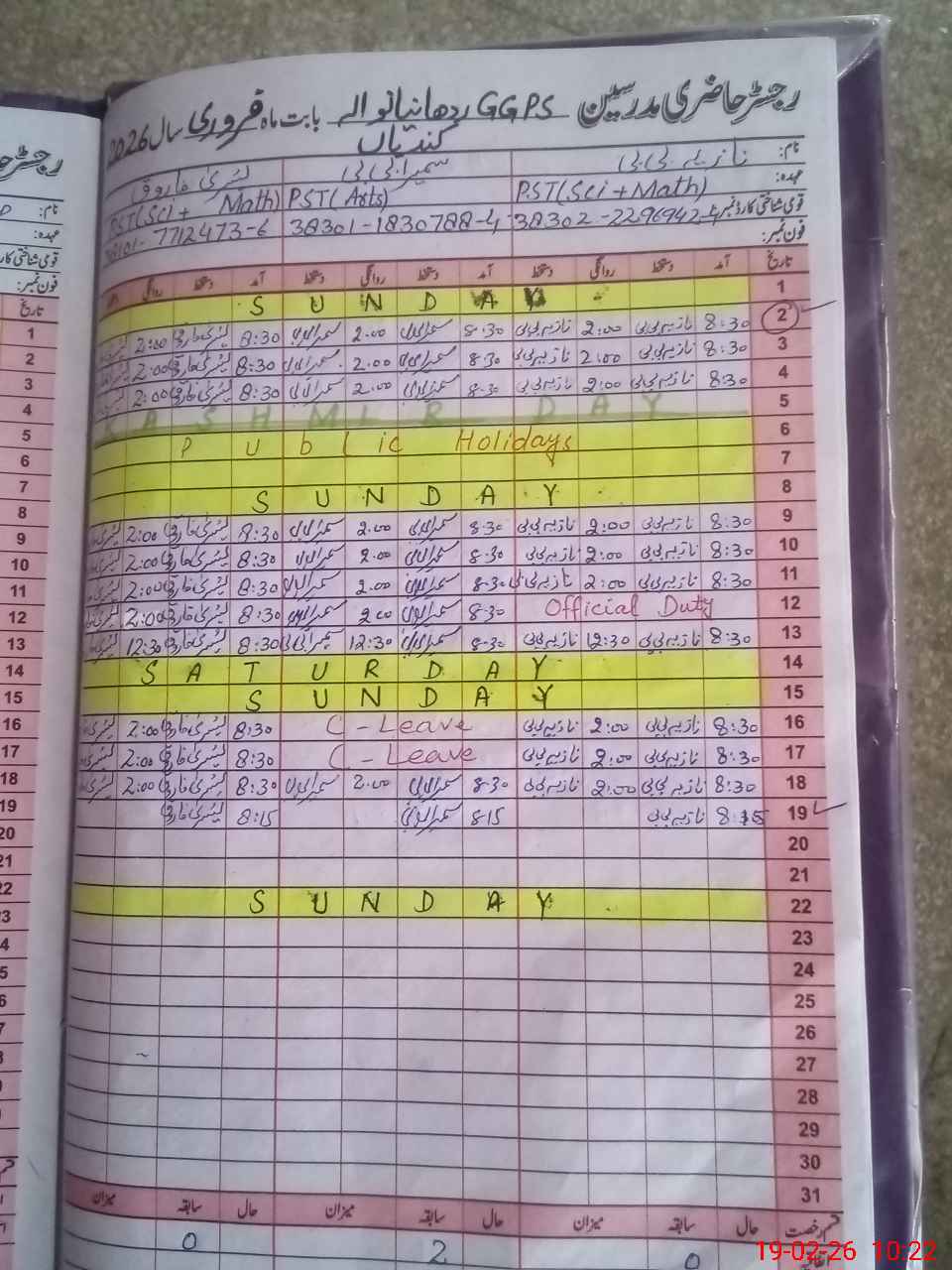 | CNIC | Full Name | Designation | R/C | Absence During Last Calender Month |