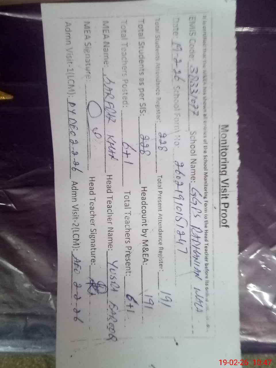 | Attendance Register | Head Teacher | MEA with School | Visit Proof |