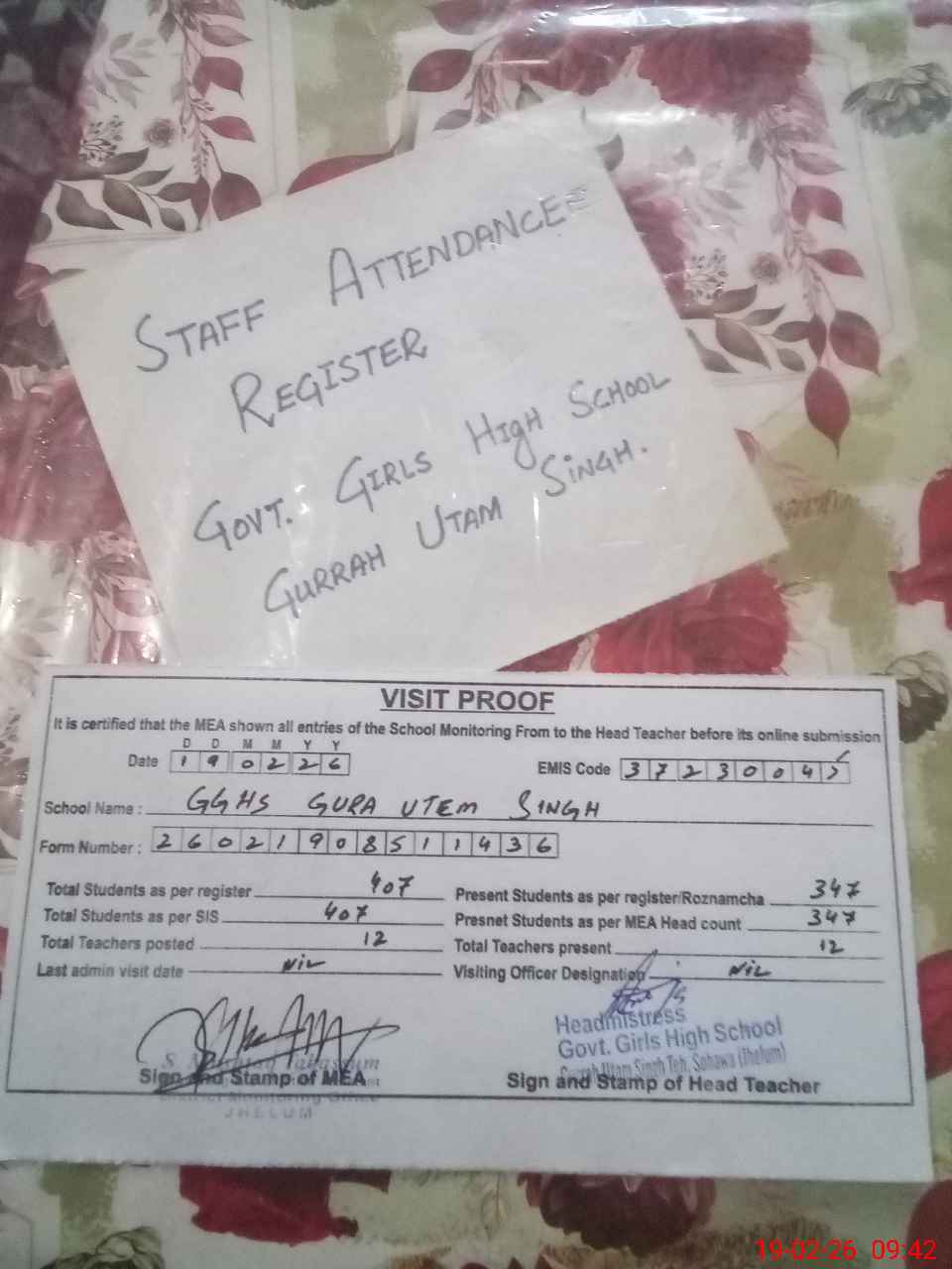 | Attendance Register | Head Teacher | MEA with School | Visit Proof |