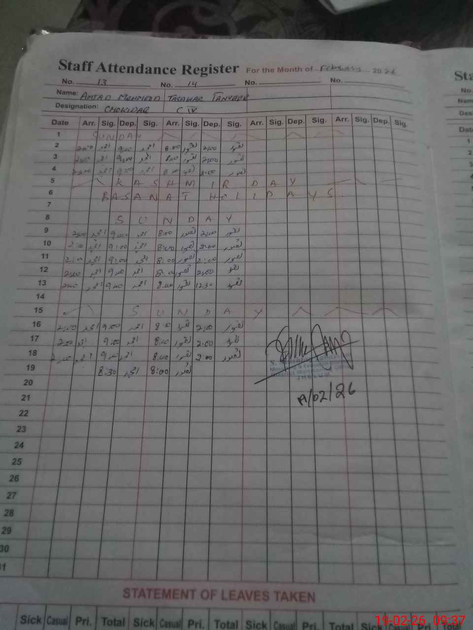| CNIC | Full Name | Designation | R/C | Absence During Last Calender Month |