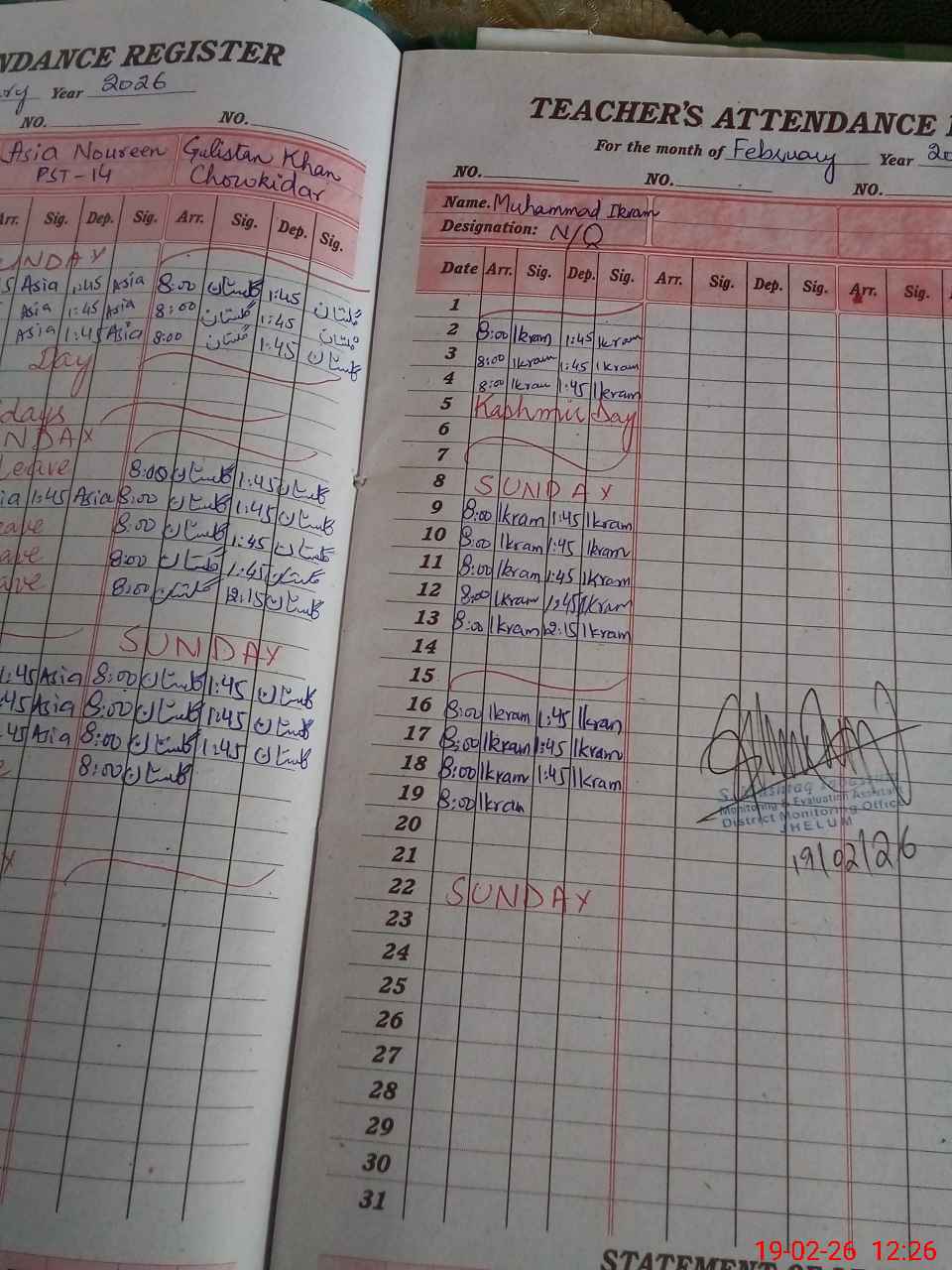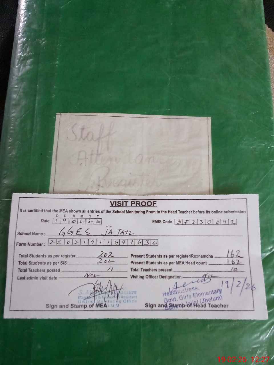 | Attendance Register | Head Teacher | MEA with School | Visit Proof |