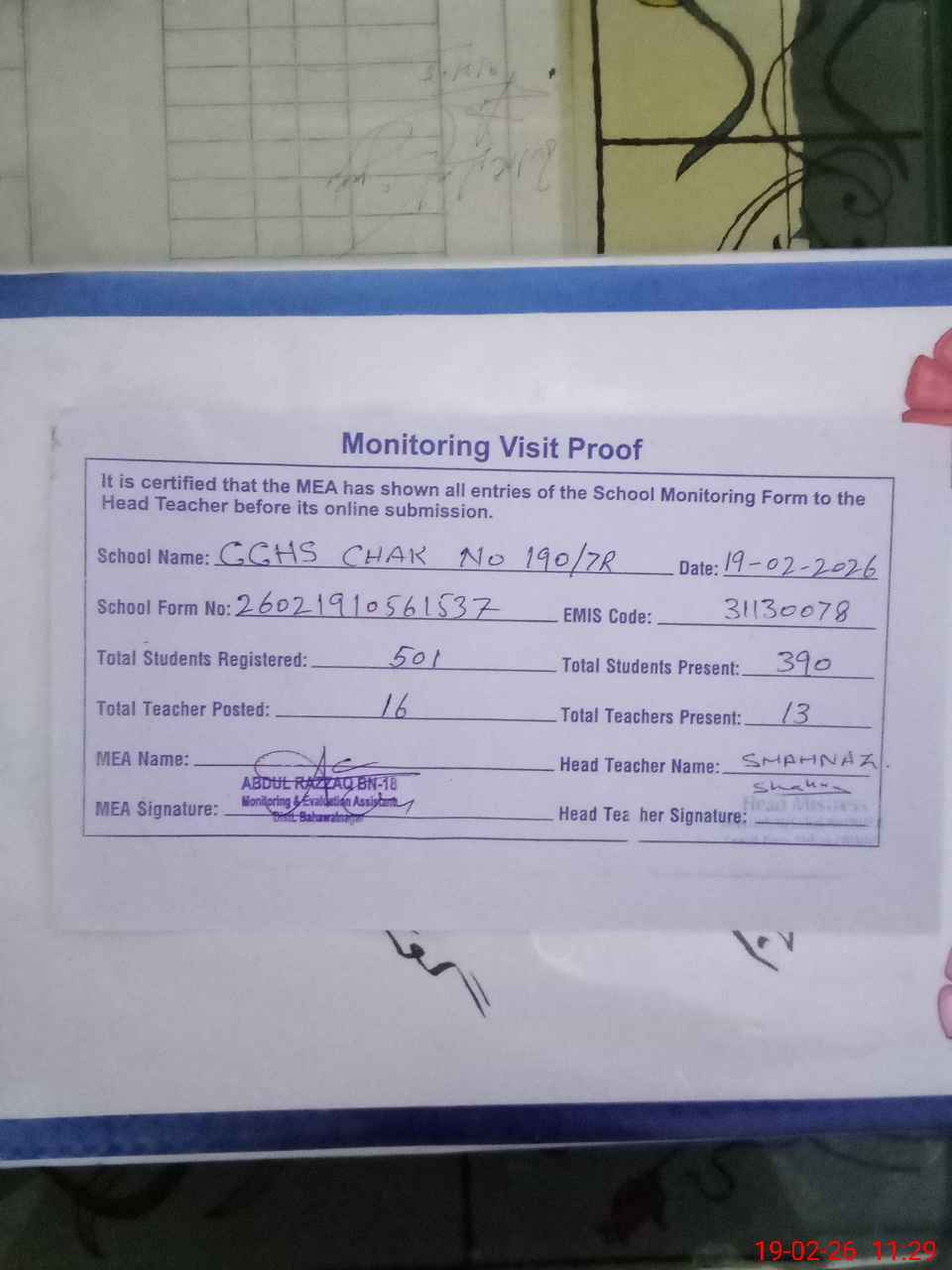 | Attendance Register | Head Teacher | MEA with School | Visit Proof |