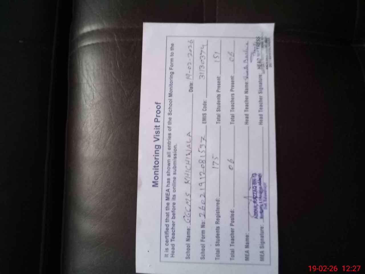 | Attendance Register | Head Teacher | MEA with School | Visit Proof |