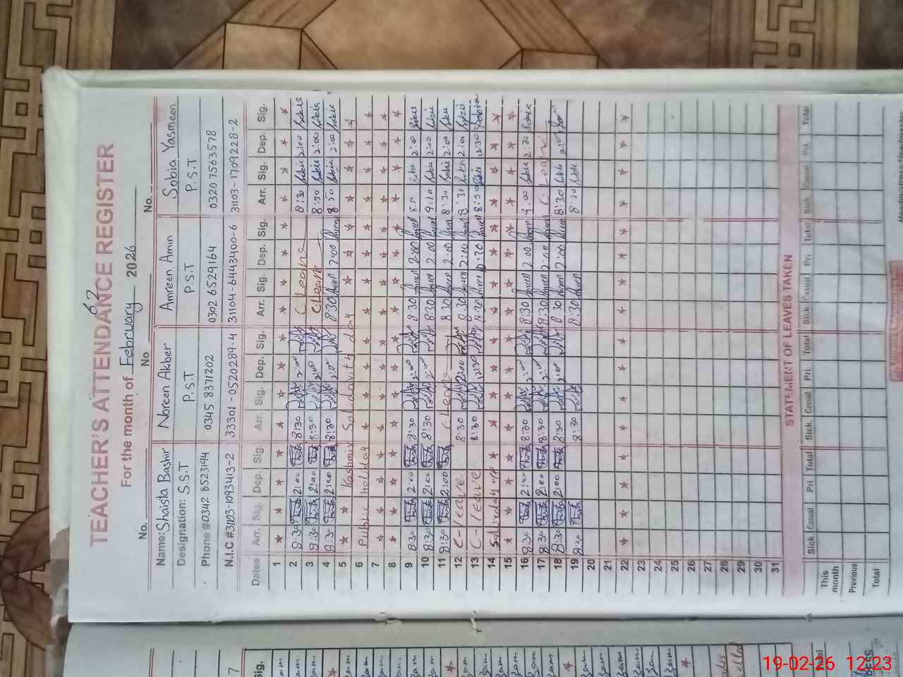 | CNIC | Full Name | Designation | R/C | Absence During Last Calender Month |