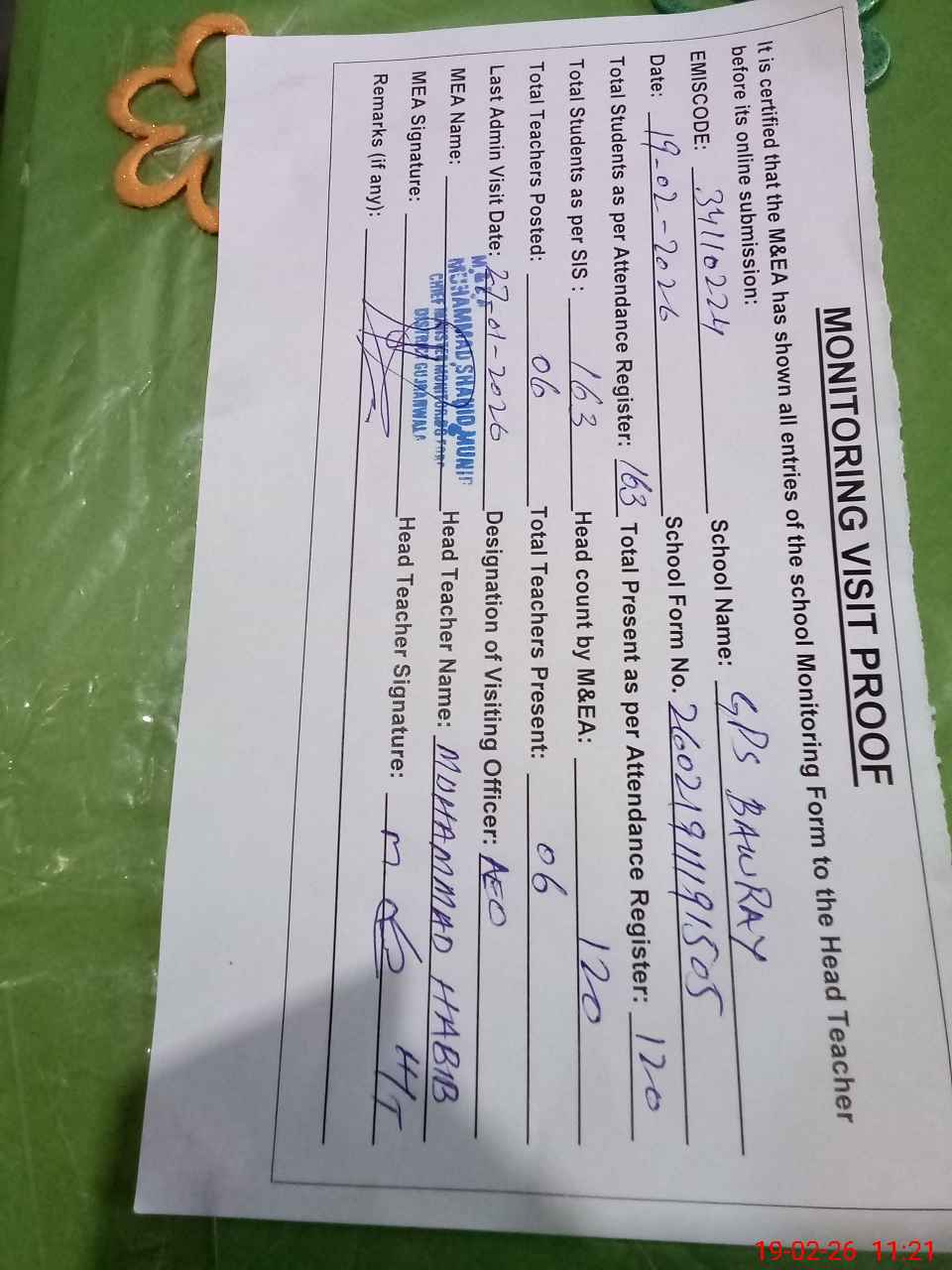| Attendance Register | Head Teacher | MEA with School | Visit Proof |
