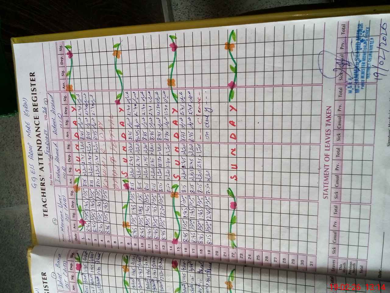 | No. of Students Present - Male | 0 | 0 | 9 | 0 | 0 | 0 | 0 | 0 | 0 | 0 | 26 | |||||