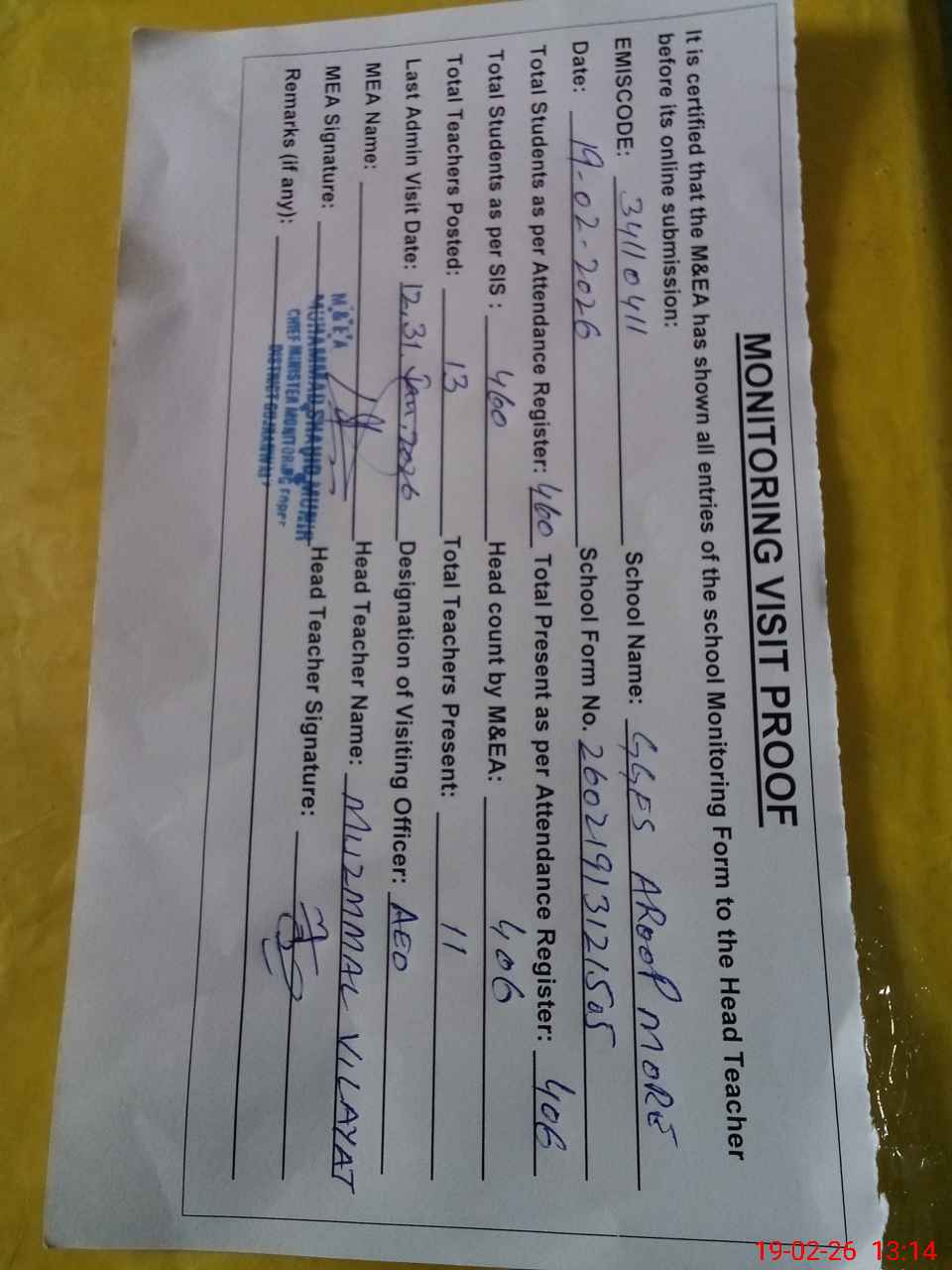 | Attendance Register | Head Teacher | MEA with School | Visit Proof |