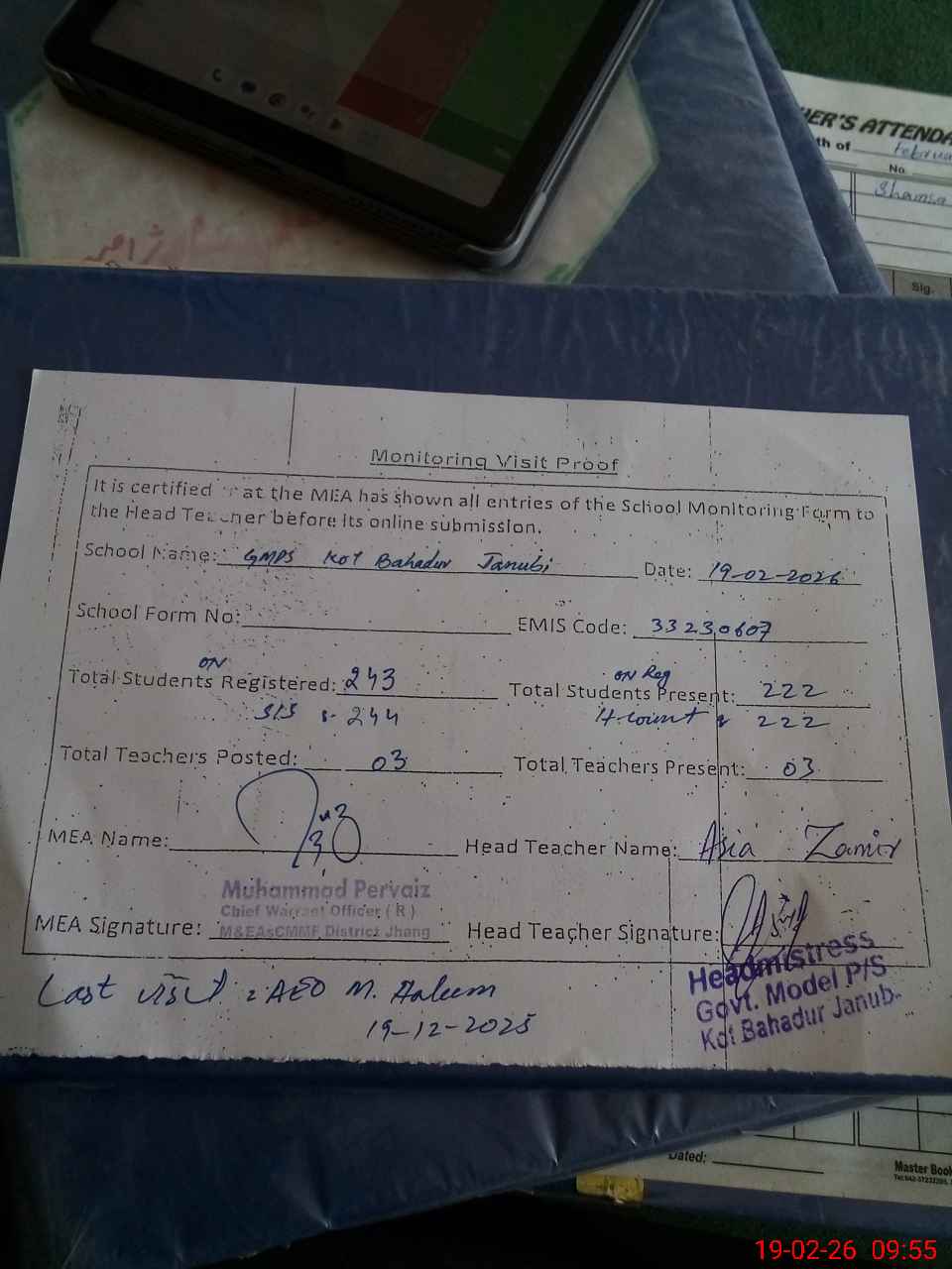 | Attendance Register | Head Teacher | MEA with School | Visit Proof |