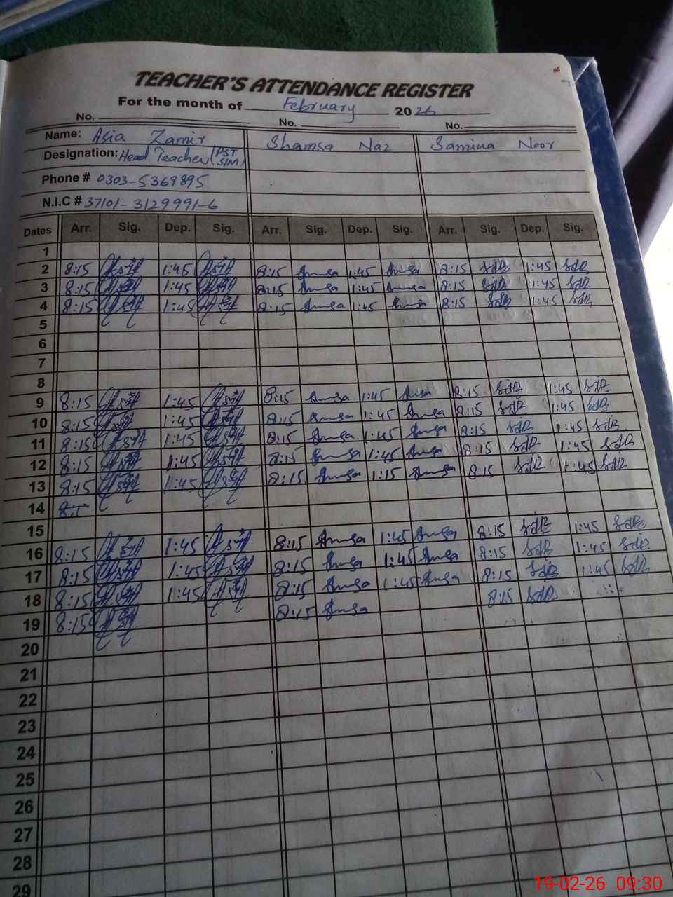 | Name: AS**** ZA**** Designation: (School Headmaster's/Headmistress's) PST Phone/Cell Number: 03**** |