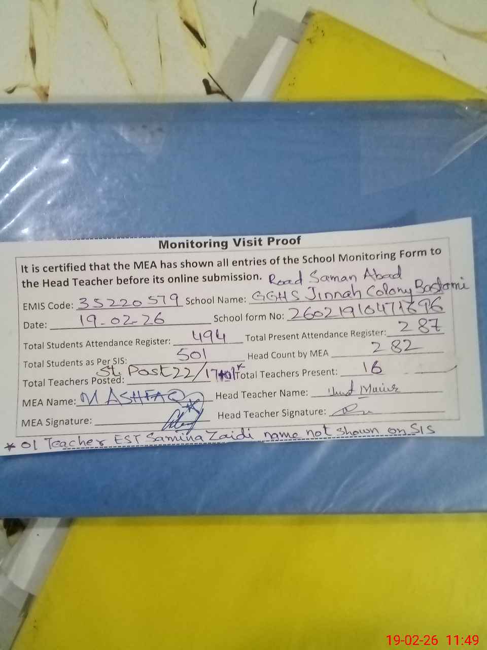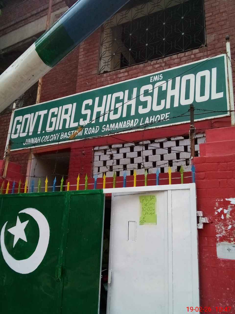 | EMIS Code: 35220579 | Name of School: GGHS JINNAH COLONY BASTAMI ROAD SAMANABAD EX-MCL (Newly Upgraded) | |||
