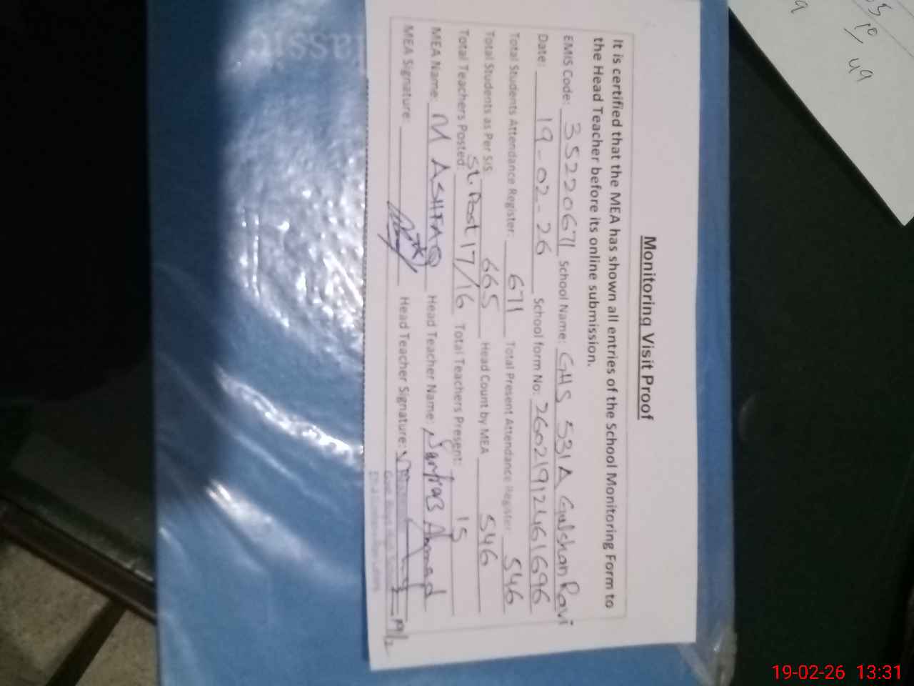 | Attendance Register | Head Teacher | MEA with School | Visit Proof |