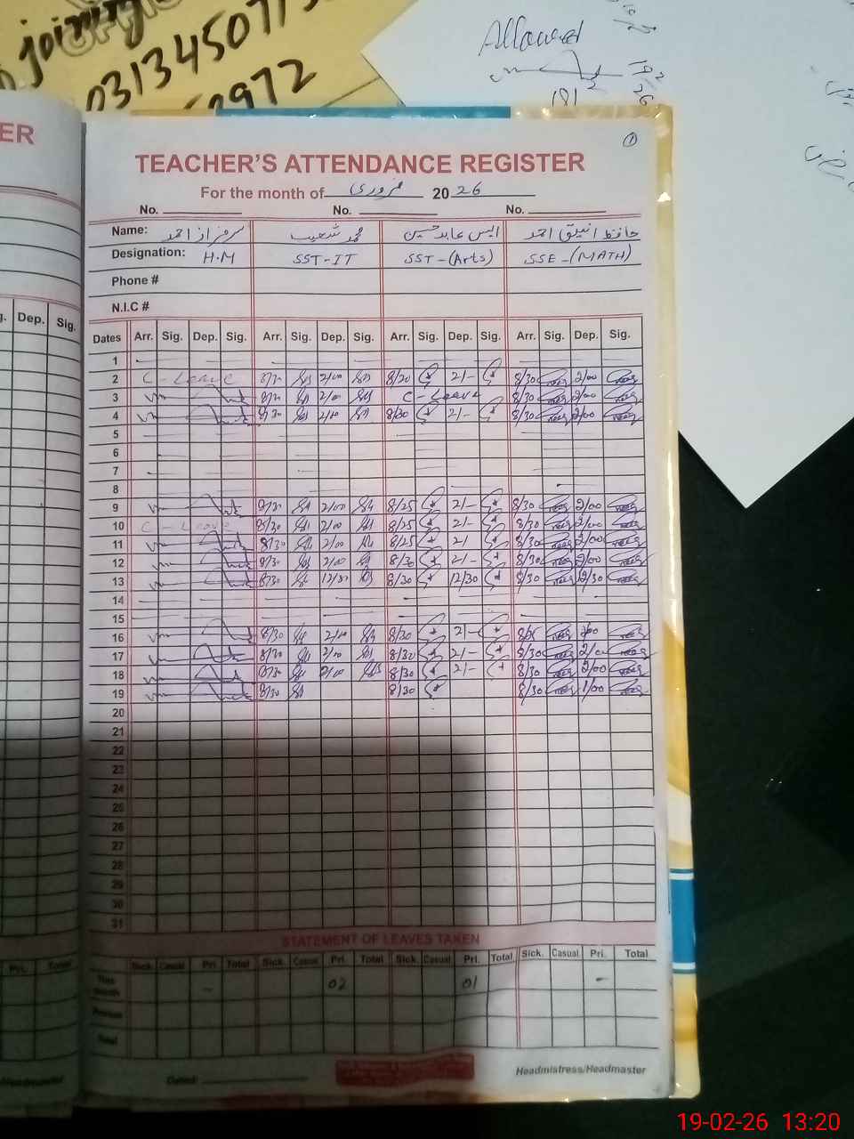 | CNIC | Full Name | Designation | R/C | Absence During Last Calender Month |