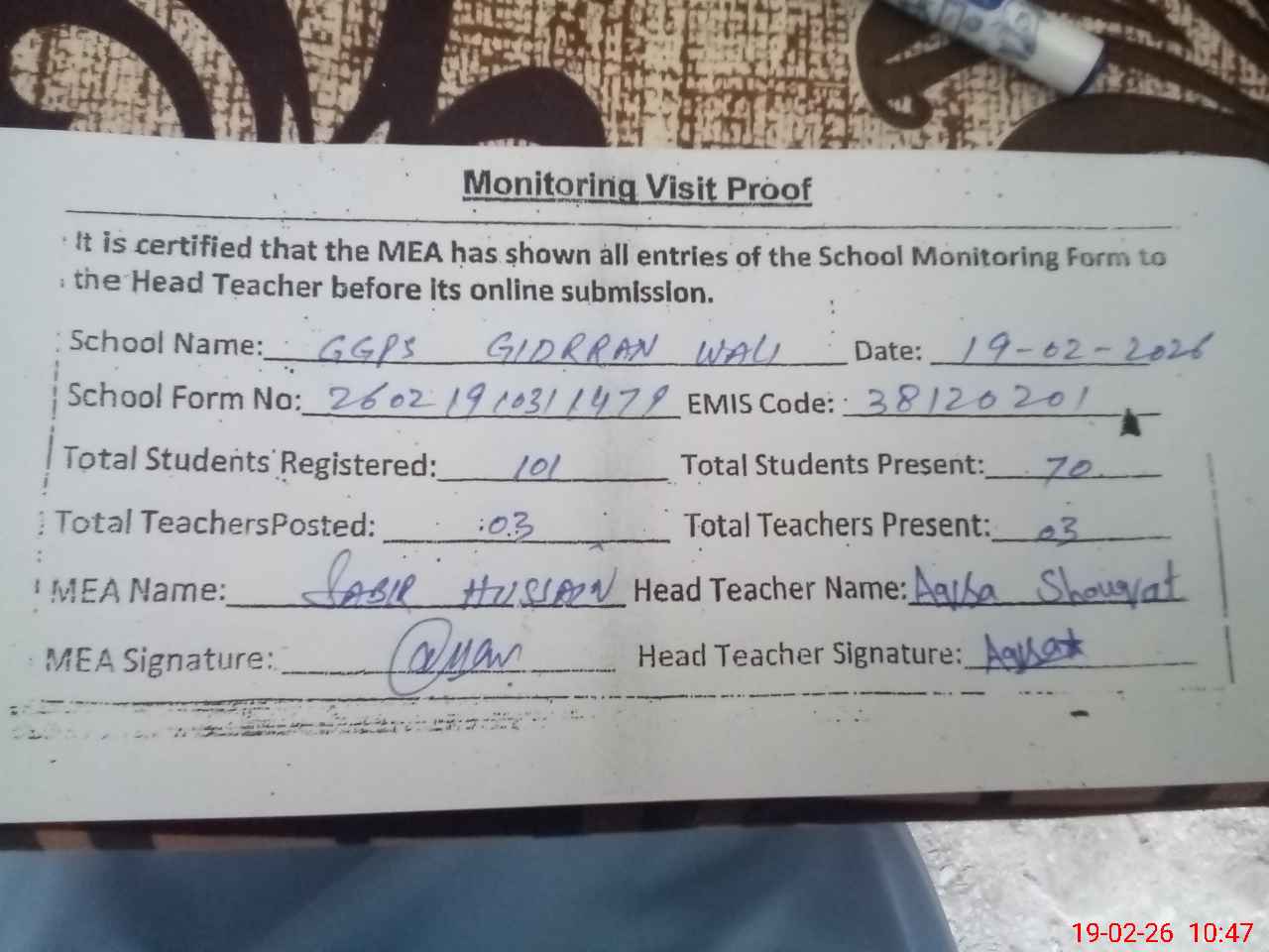 | EMIS Code: 38120201 | Name of School: GGPS GIDRRAN WALI | |||