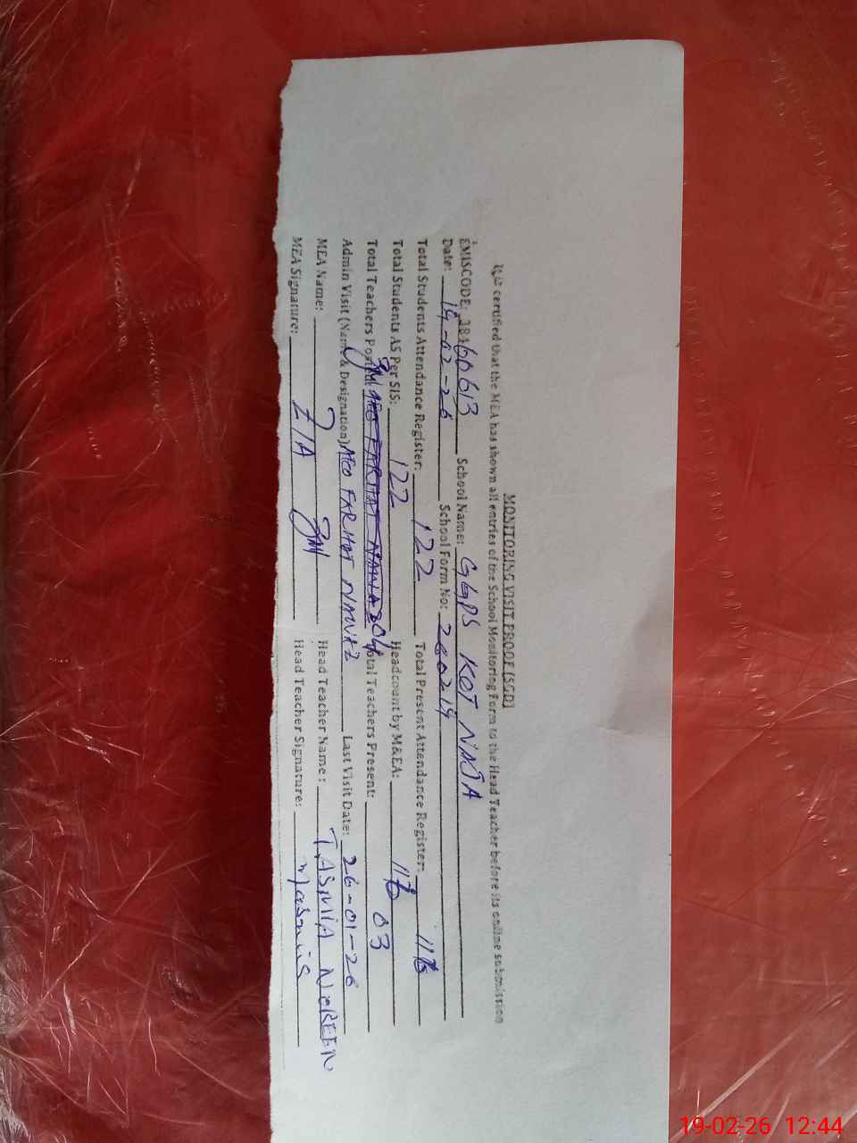 | Attendance Register | Head Teacher | MEA with School | Visit Proof |