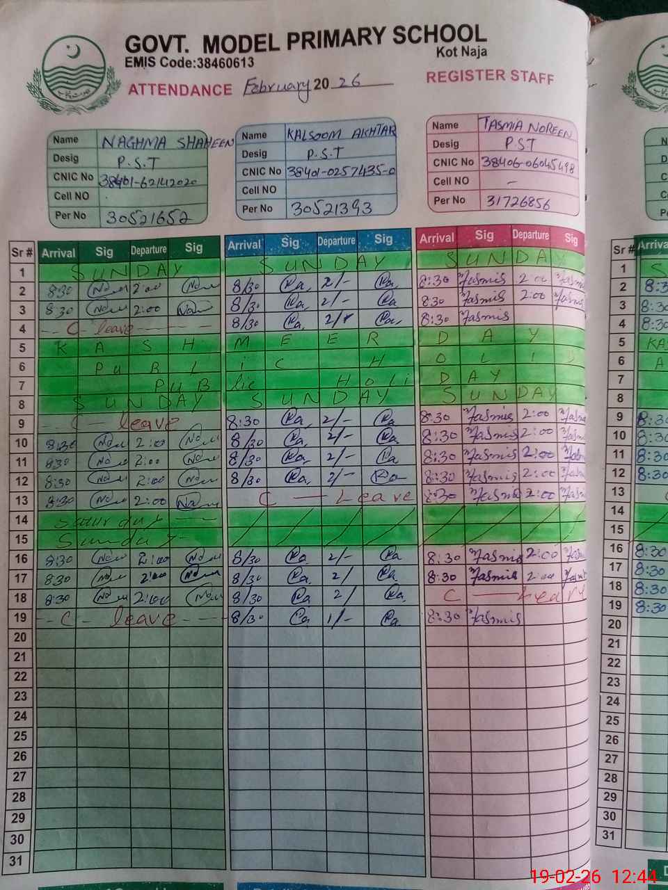 | CNIC | Full Name | Designation | R/C | Absence During Last Calender Month |