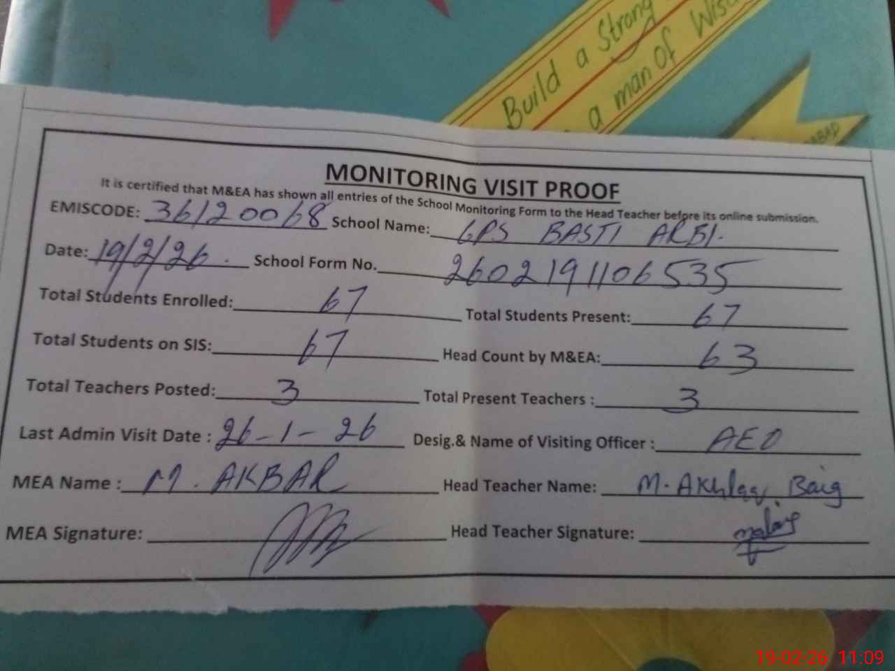 | EMIS Code: 36120068 | Name of School: GPS BASTI ARBI P/O SHUJABAD MOZA GAJU HATTA | |||