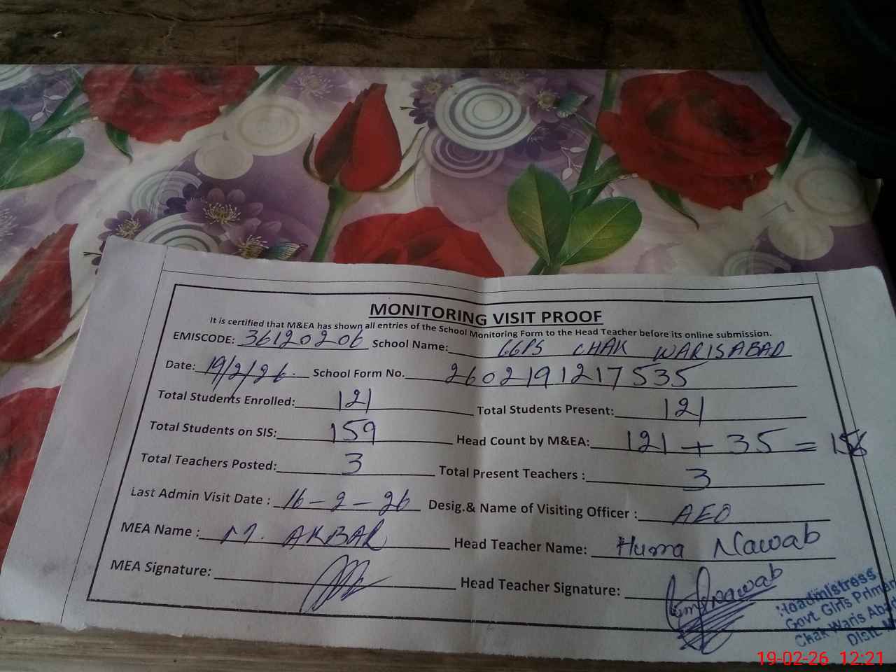 | Attendance Register | Head Teacher | MEA with School | Visit Proof |