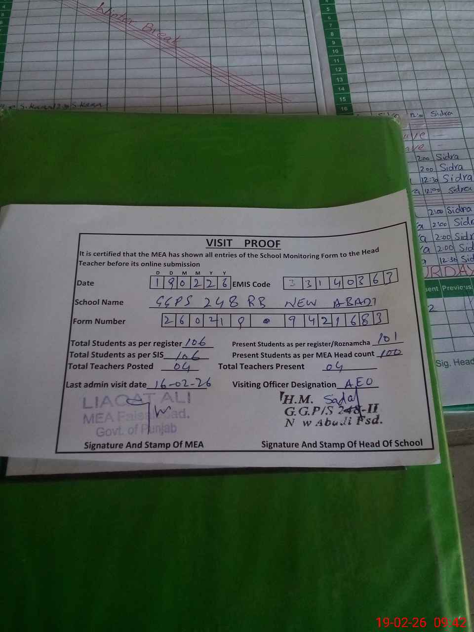 | Attendance Register | Head Teacher | MEA with School | Visit Proof |