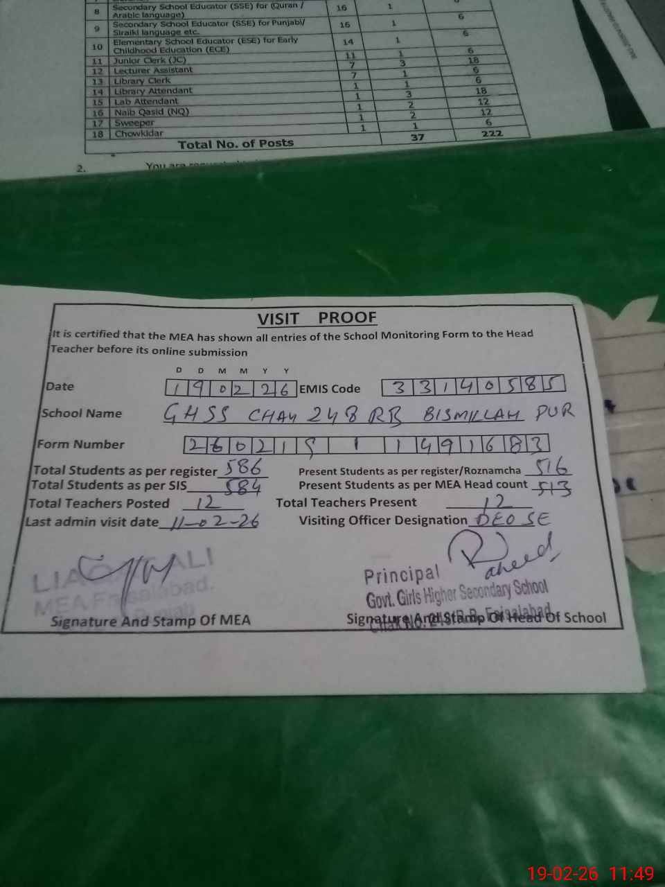 | Remarks (Use Separate Page if Required): JC Abid Hussain attached from GGHS Chak 85 GB wef 2 December 2025 to 28 February 2026 DEO SE visited this school on 11 February 2026 | |||||