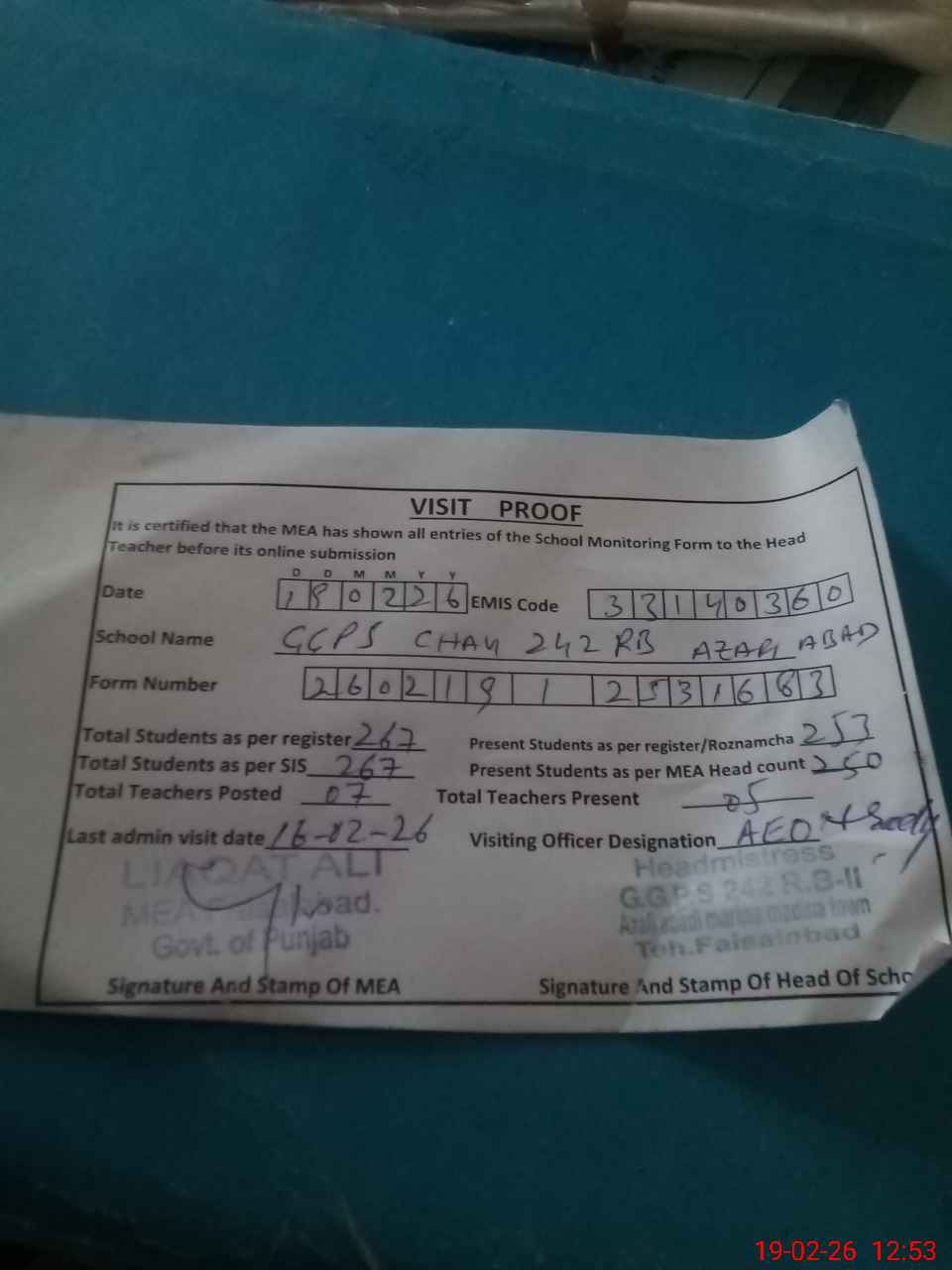 | Attendance Register | Head Teacher | MEA with School | Visit Proof |