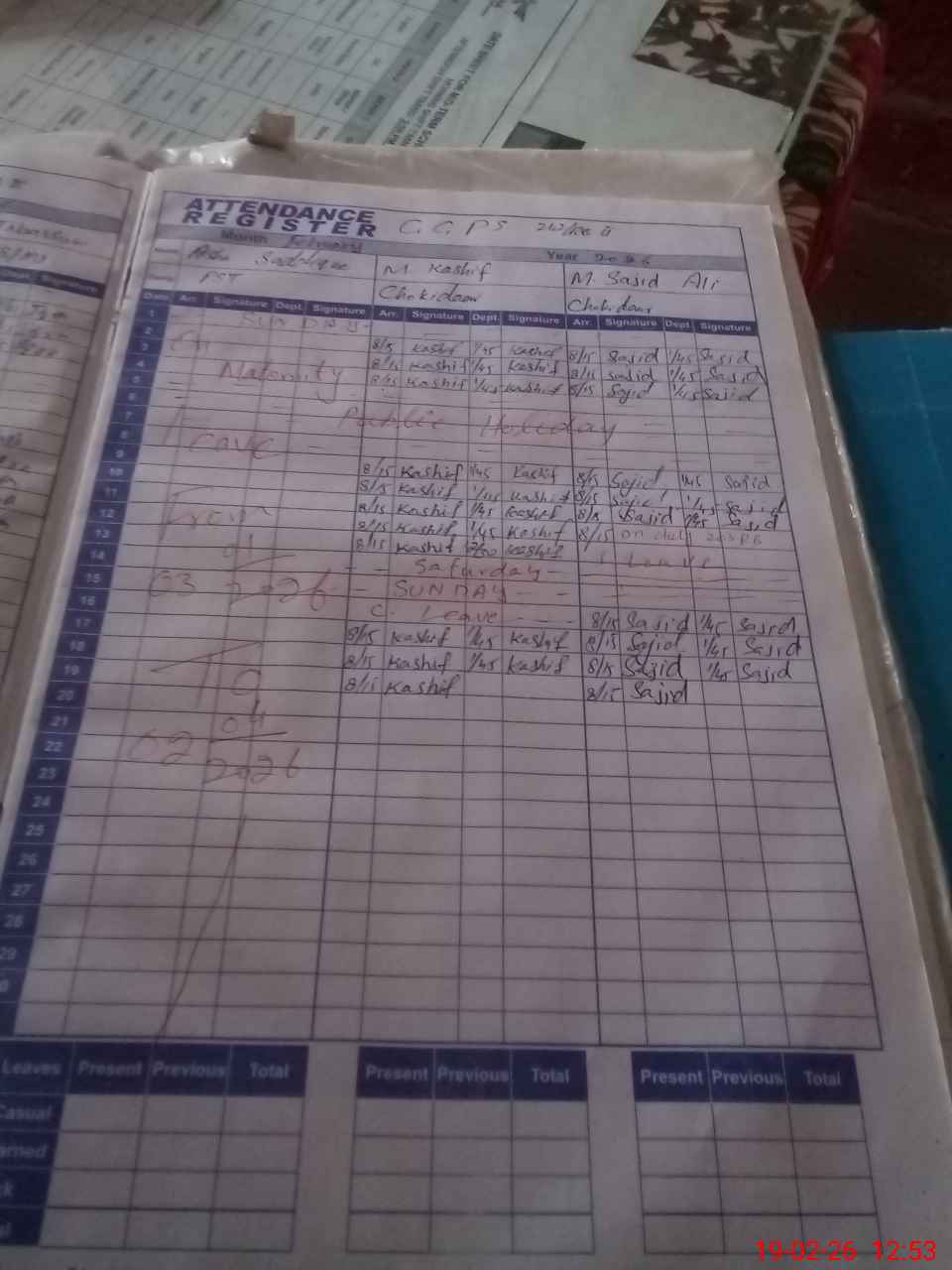 | CNIC | Full Name | Designation | R/C | Absence During Last Calender Month |