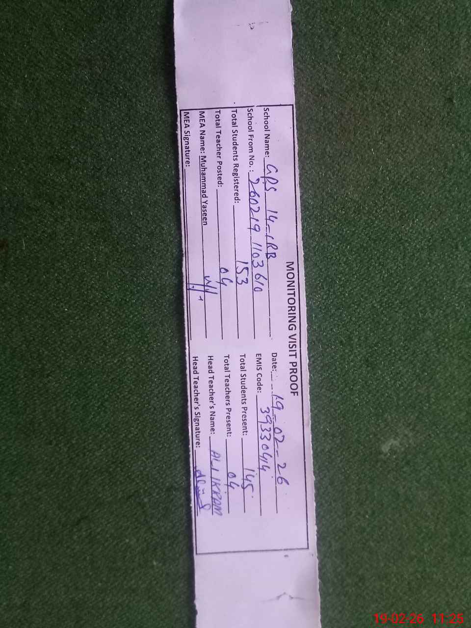 | Attendance Register | Head Teacher | MEA with School | Visit Proof |