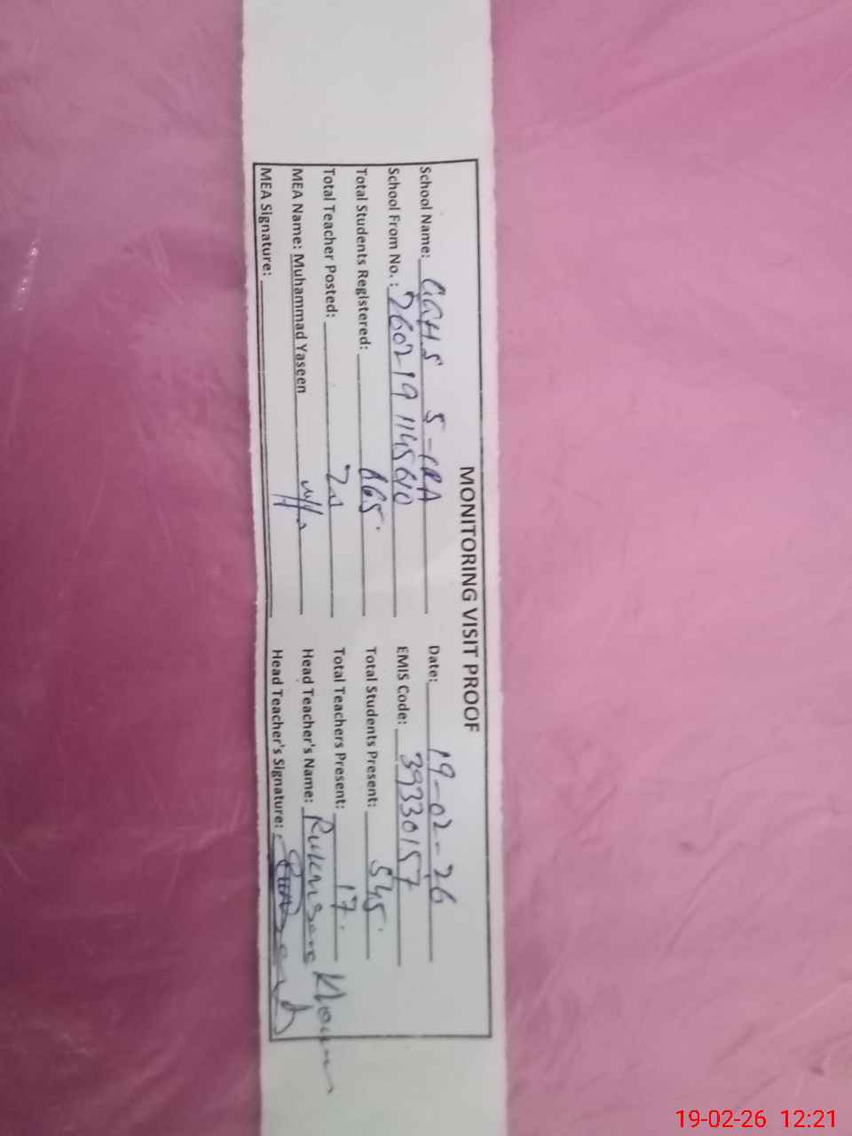 | Attendance Register | Head Teacher | MEA with School | Visit Proof |