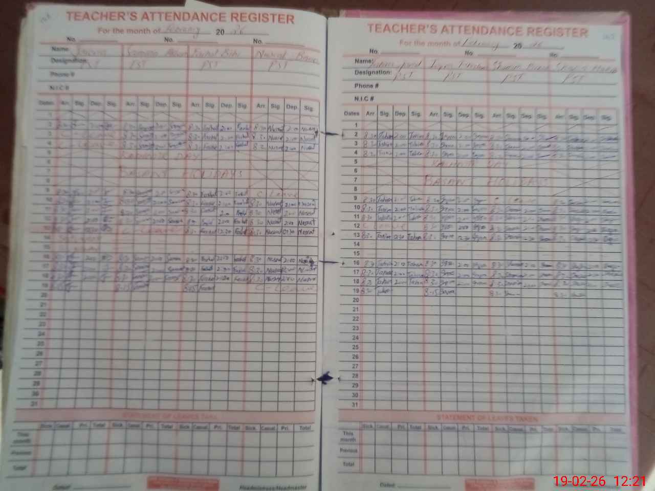 | CNIC | Full Name | Designation | R/C | Absence During Last Calender Month |