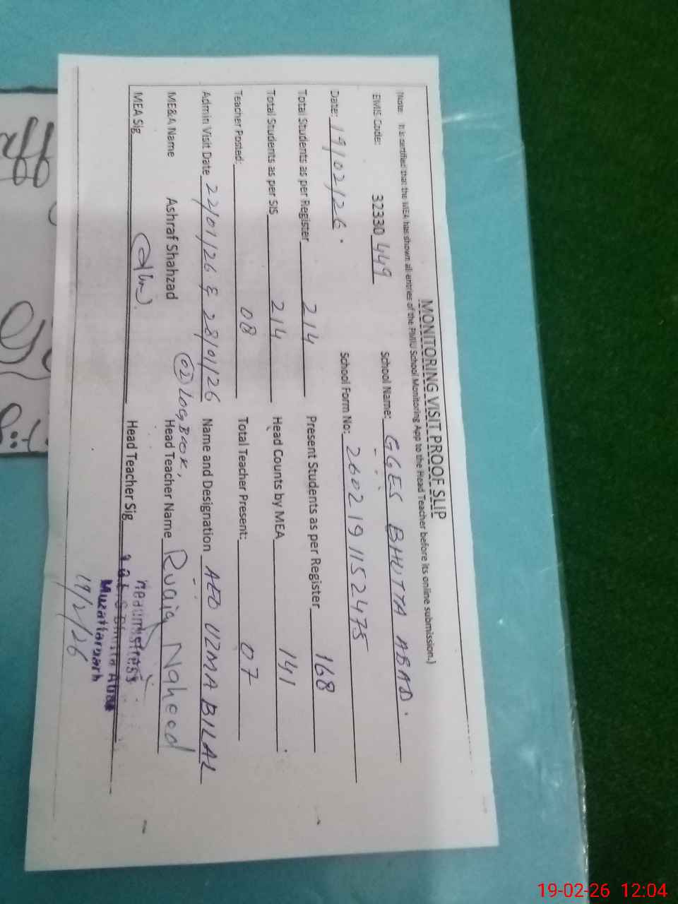 | EMIS Code: 32330449 | Name of School: GGES BHUTTA ABAD | |||
