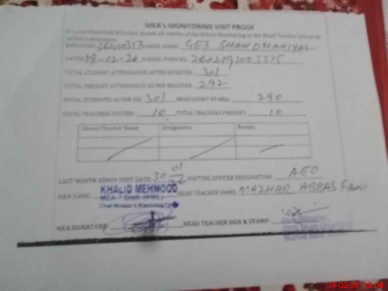 | Certified that this School was Inspected by the Undersigned MEA/DMO Today and the Information Stated Above is as Per Record. | |||||