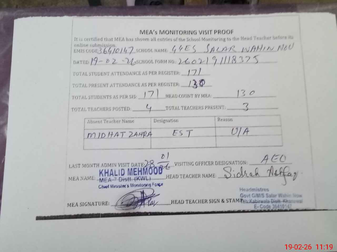 | Monitoring Date: 19-02-2026 | Start Time: 19-02-2026 10:26 AM | End Time: 19-02-2026 11:21 AM | Name of MEA: Kh**** Me**** | |