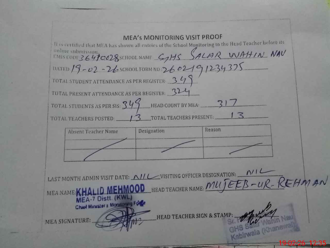 | EMIS Code: 36410028 | Name of School: GHS SALAR WAHIN NAU, NAWAN SHEHR | |||