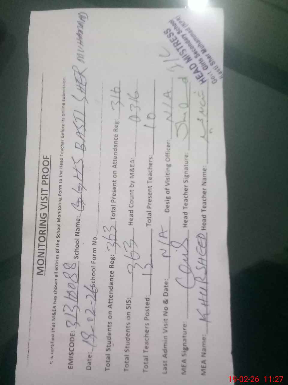 | Attendance Register | Head Teacher | MEA with School | Visit Proof |