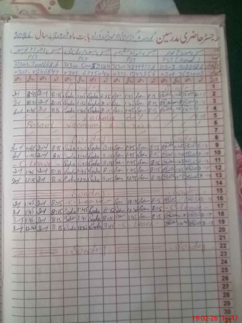 | CNIC | Full Name | Designation | R/C | Absence During Last Calender Month |