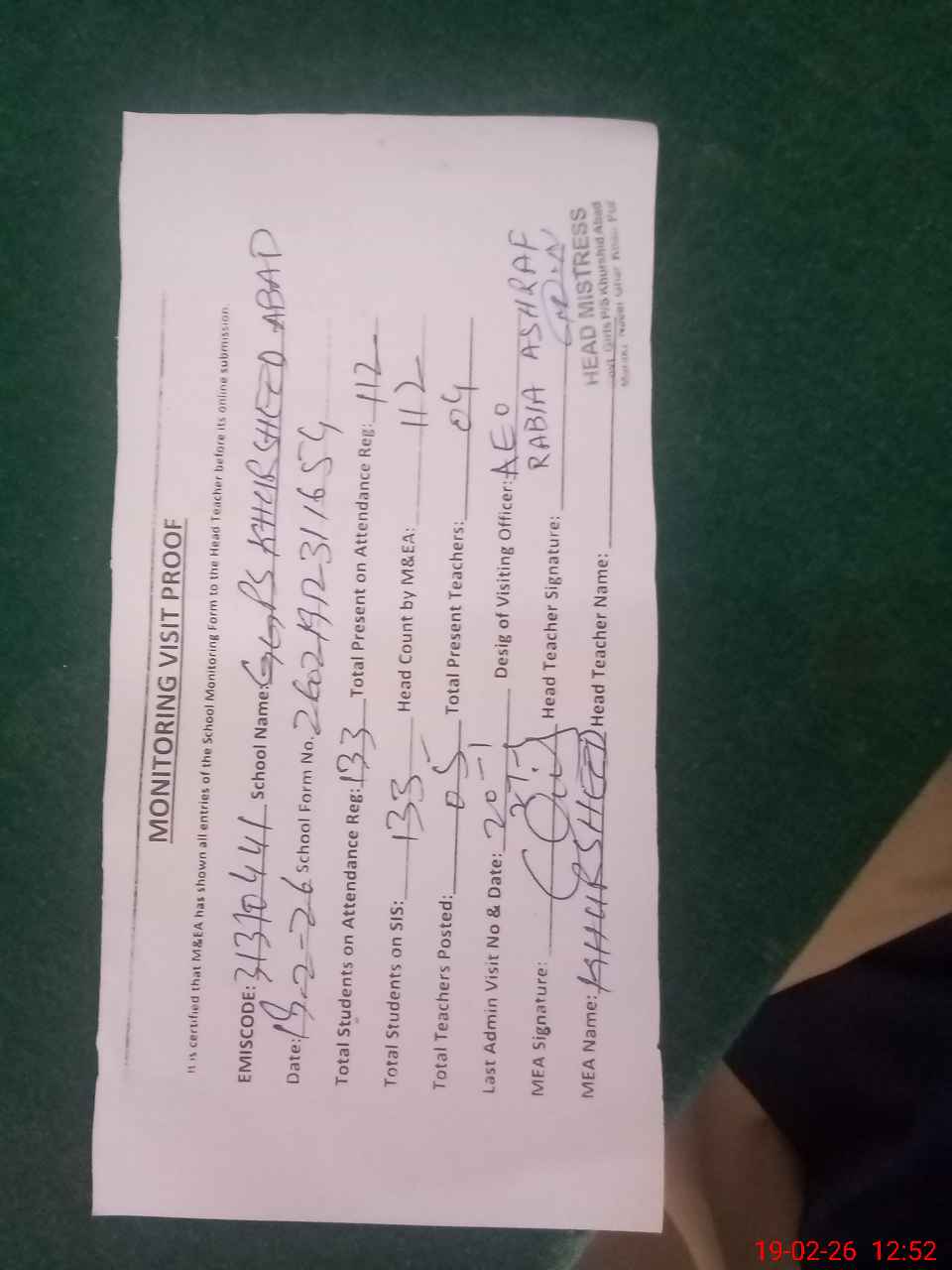 | Attendance Register | Head Teacher | MEA with School | Visit Proof |