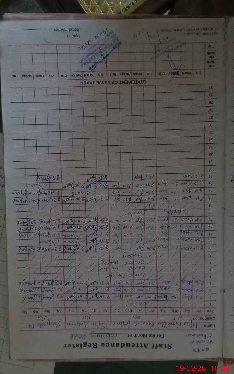 | CNIC | Full Name | Designation | R/C | Absence During Last Calender Month |
