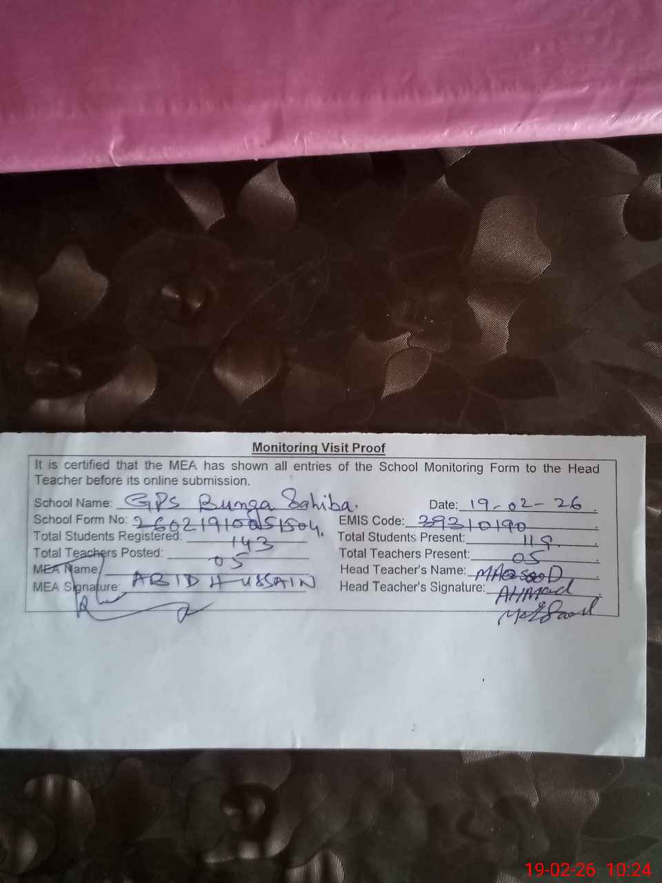 | Certified that this School was Inspected by the Undersigned MEA/DMO Today and the Information Stated Above is as Per Record. | |||||
