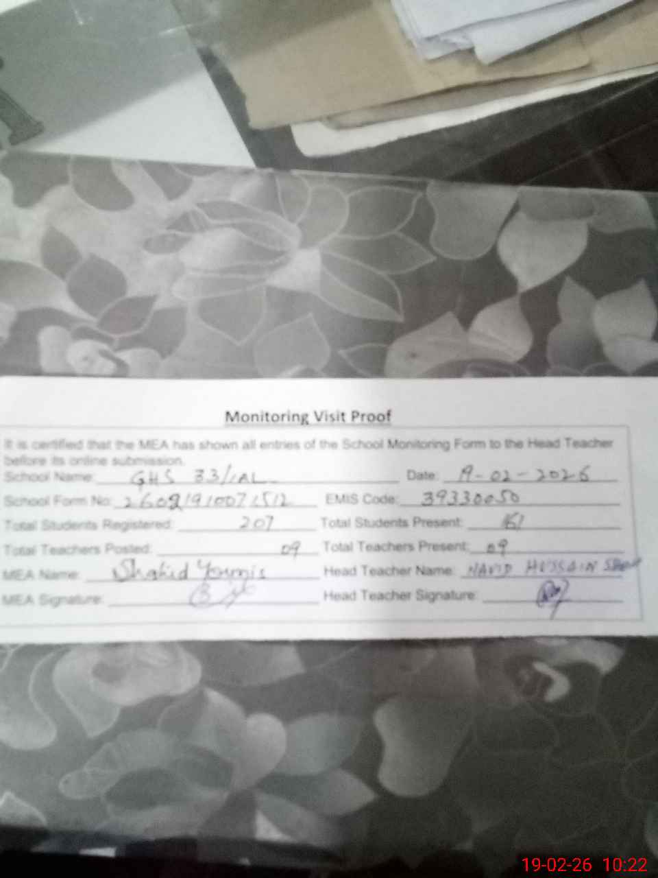 | Certified that this School was Inspected by the Undersigned MEA/DMO Today and the Information Stated Above is as Per Record. | |||||