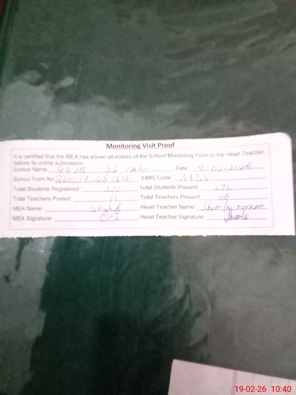 | Certified that this School was Inspected by the Undersigned MEA/DMO Today and the Information Stated Above is as Per Record. | |||||