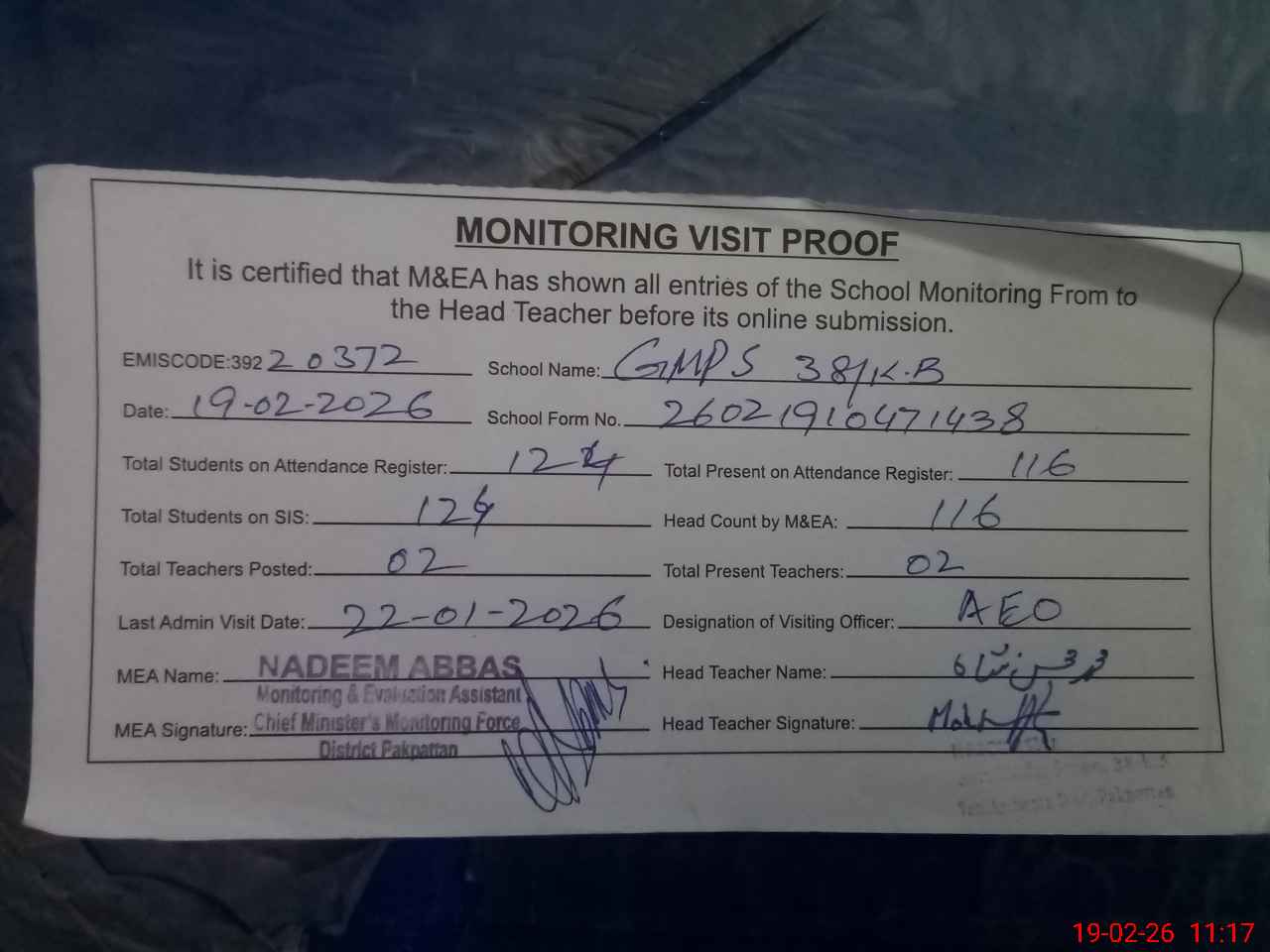 | EMIS Code: 39220372 | Name of School: GMPS CHAK NO 38 KB | |||