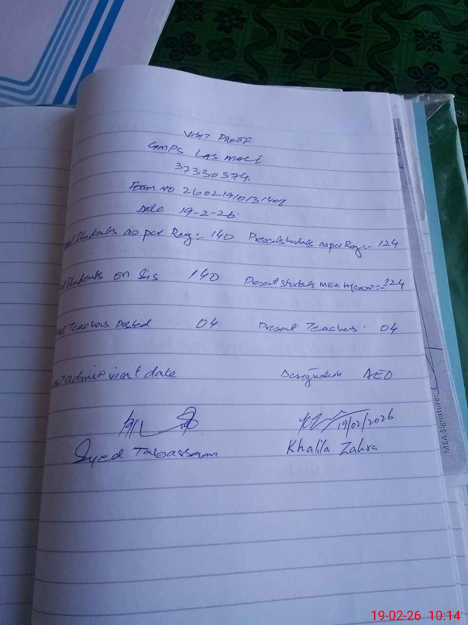 | Attendance Register | Head Teacher | MEA with School | Visit Proof |