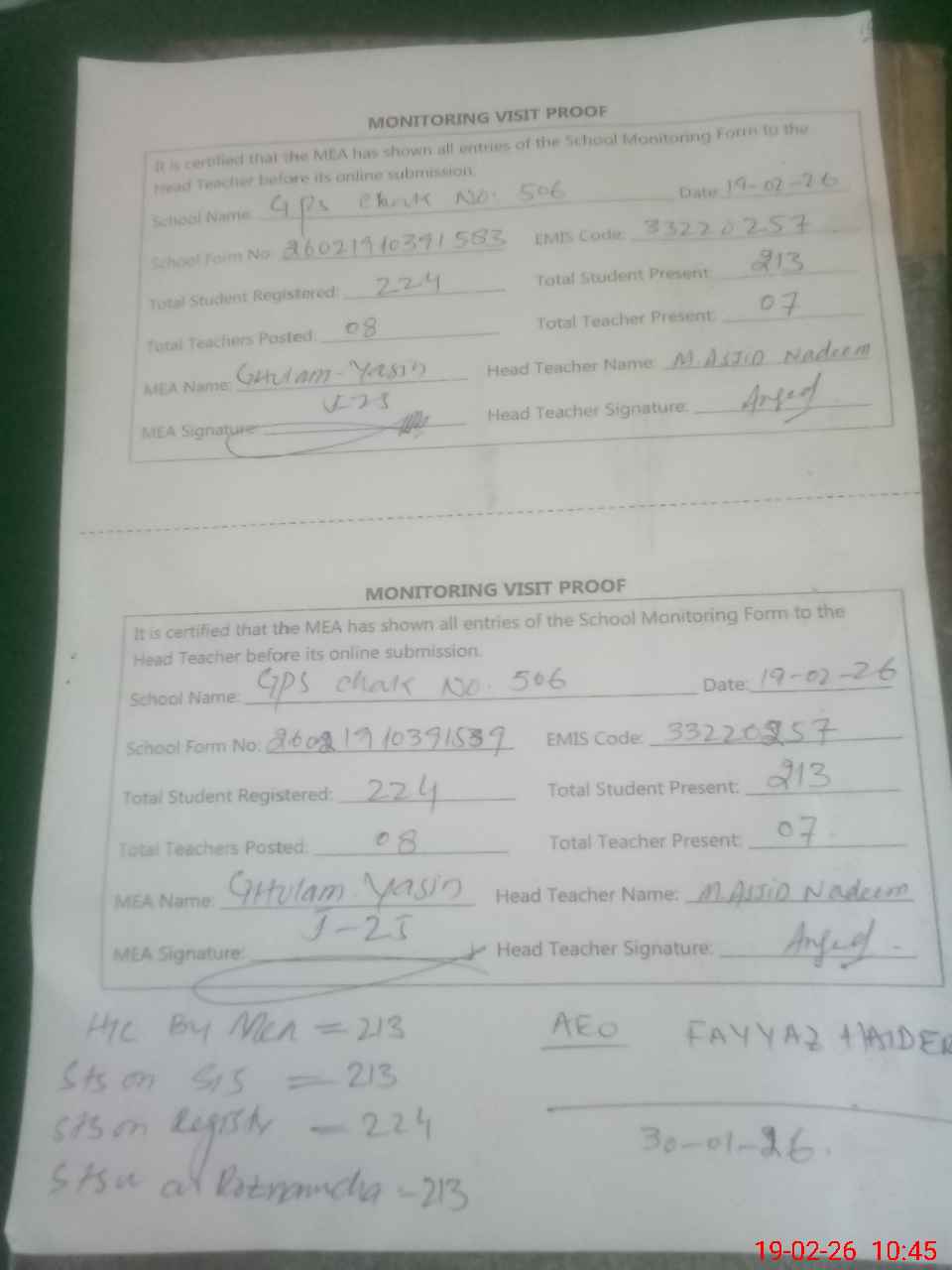 | Attendance Register | Head Teacher | MEA with School | Visit Proof |