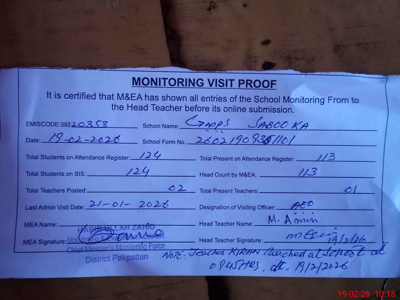 | Monitoring Date: 19-02-2026 | Start Time: 19-02-2026 09:30 AM | End Time: 19-02-2026 10:15 AM | Name of MEA: Ha**** Ul**** Ur**** Ba**** Al**** | |
