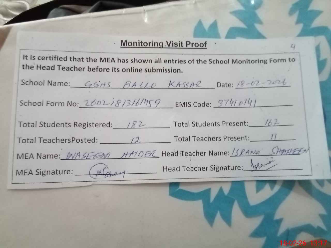 | Attendance Register | Head Teacher | MEA with School | Visit Proof |