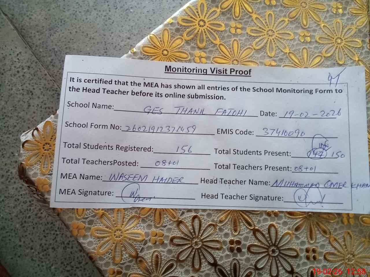 | Certified that this School was Inspected by the Undersigned MEA/DMO Today and the Information Stated Above is as Per Record. | |||||