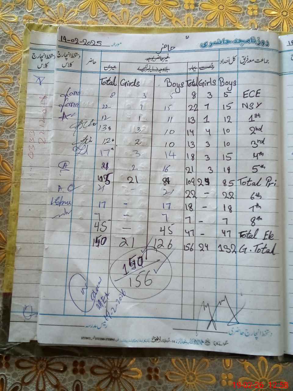 | Total Students Present | 0 | 8 | 12 | 13 | 12 | 17 | 21 | 21 | 17 | 7 | 150 | |||||