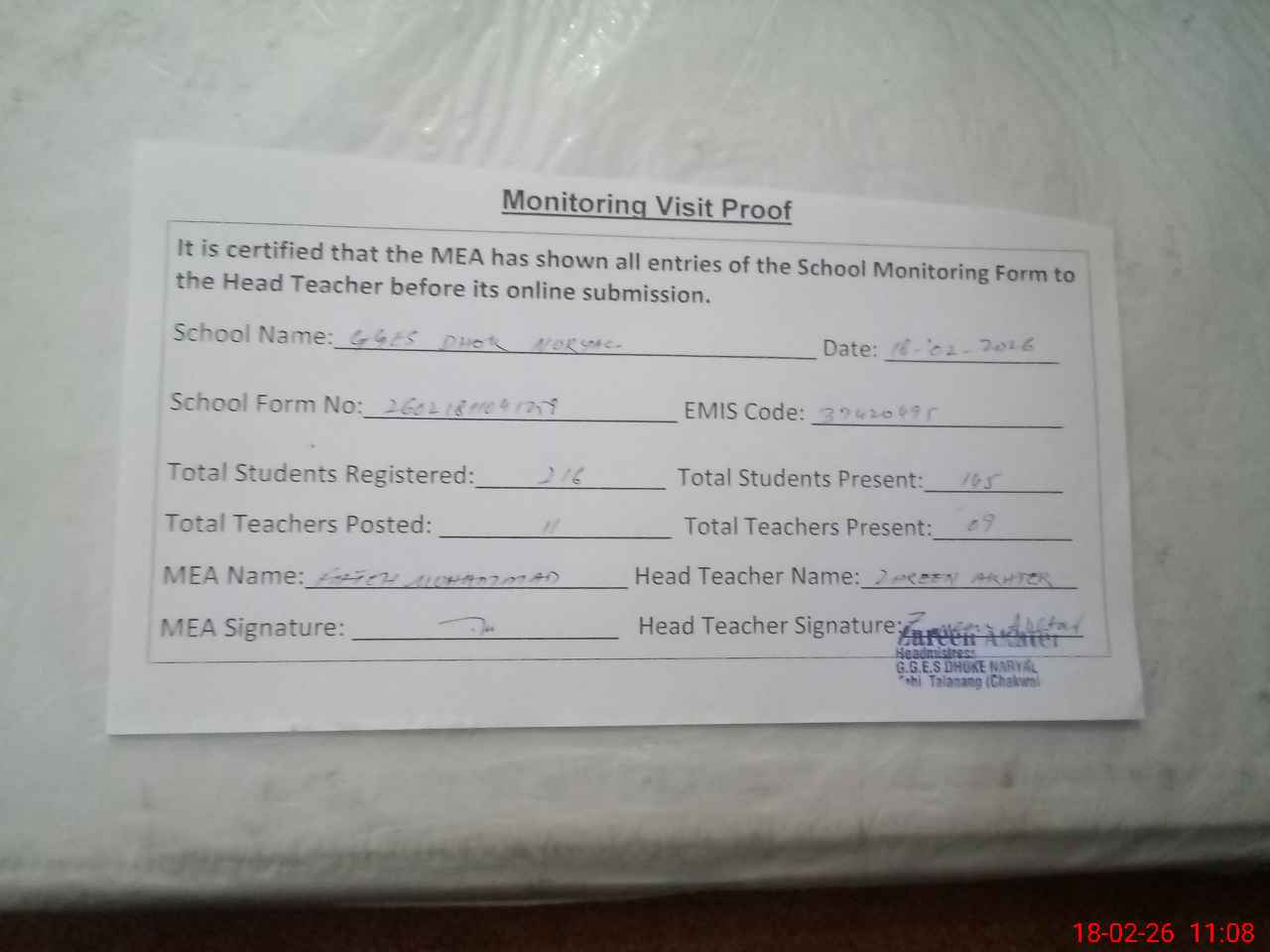 | Attendance Register | Head Teacher | MEA with School | Visit Proof |