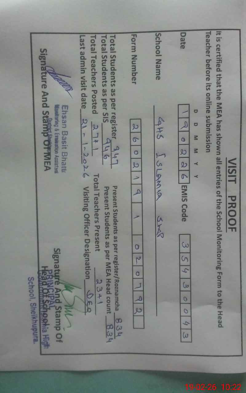 | EMIS Code: 35430043 | Name of School: GHS ISLAMIA SHEIKHUPURA | |||